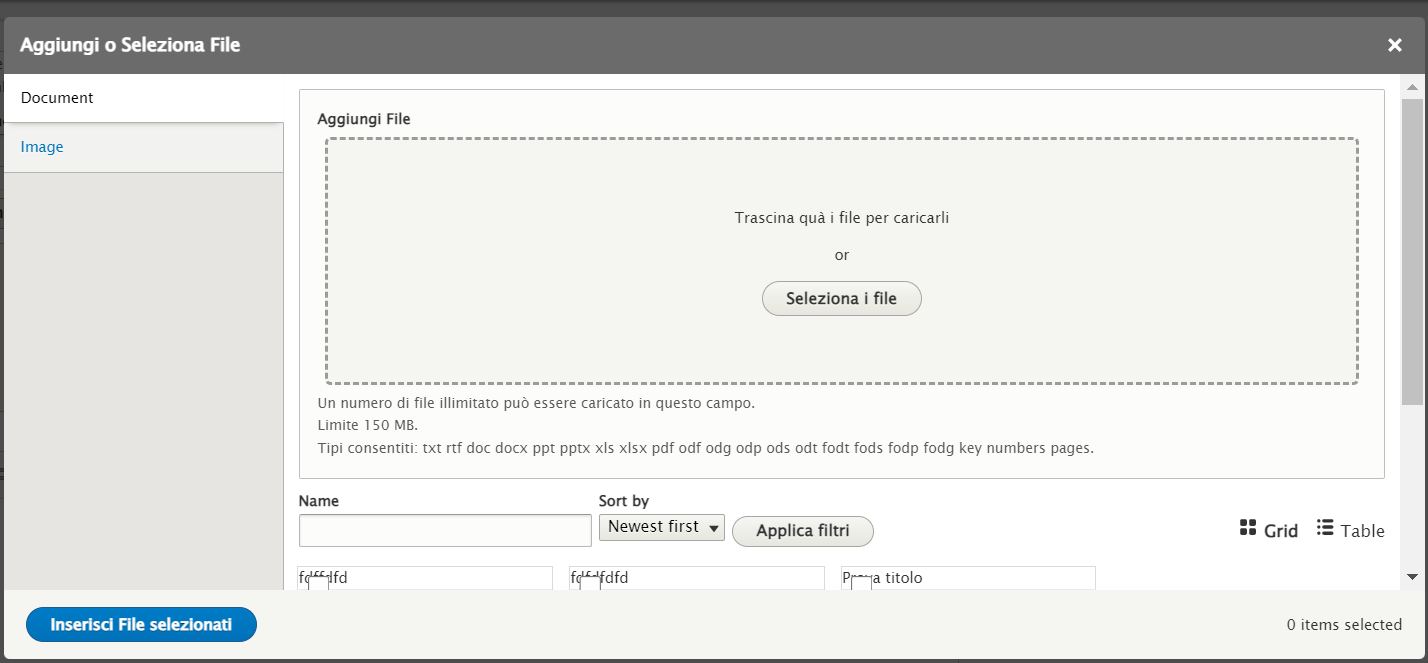 Nella finestra che si aprirà potremo decidere se allegare un file già caricato precedentemente, e quindi selezionarlo dall'elenco, oppure caricare un nuovo file cliccando su "Seleziona file" oppure trascinando il file desiderato all'interno della finestra.