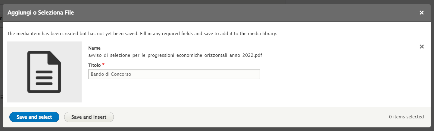 Per completare l'operazione cliccare sul pulsante "Save and Insert" e il file verrà definitivamente aggiunto.