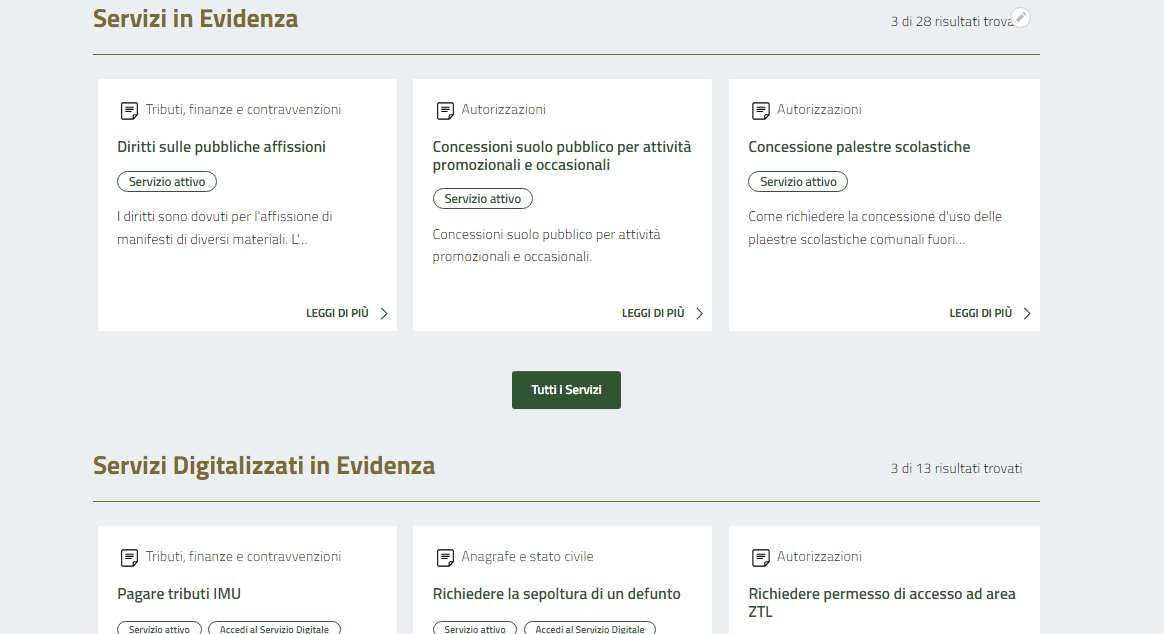 Questo contenuto permette di creare pagine dedicate ai Servizi Comunali, il cuore pulsante del portale che permette ai cittadini di avere un elenco completo dei servizi offerti dal comune, telematici e non.