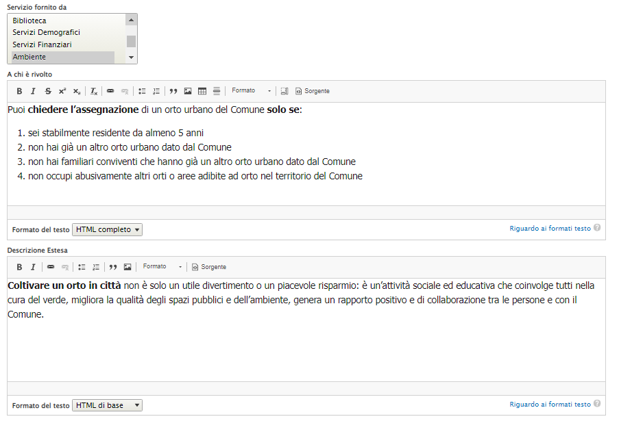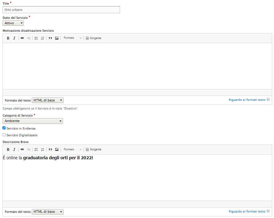 5. Popolare la "Descrizione breve", ovvero il testo che compare sotto il titolo nel box del servizio, con una breve sintesi.